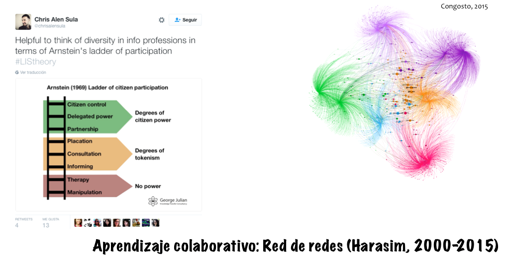 Aprender de forma colaborativo y activo; relaciones multidireccionales y entre iguales; constituyendo una red de redes (Harasim, 2000-2015). Red de redes donde se comparten ideas, información y competencias entre los participantes reforzando la producción de conocimientos, integrando y aplicando la información conceptual a seminarios, debates, dramatizaciones, proyectos en grupo y otras tareas académicas.