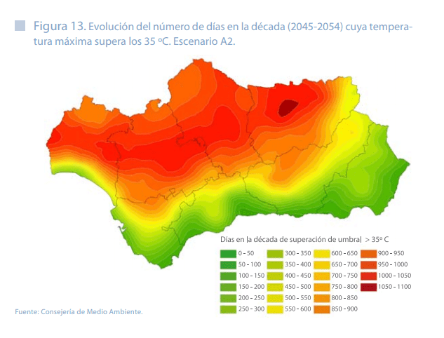 Además en 2050 casi todos los días serán de calor (más del 60% de los días serán de calor); prácticamente podemos decir que en Sevilla, solo habrá dos estaciones: primavera y verano