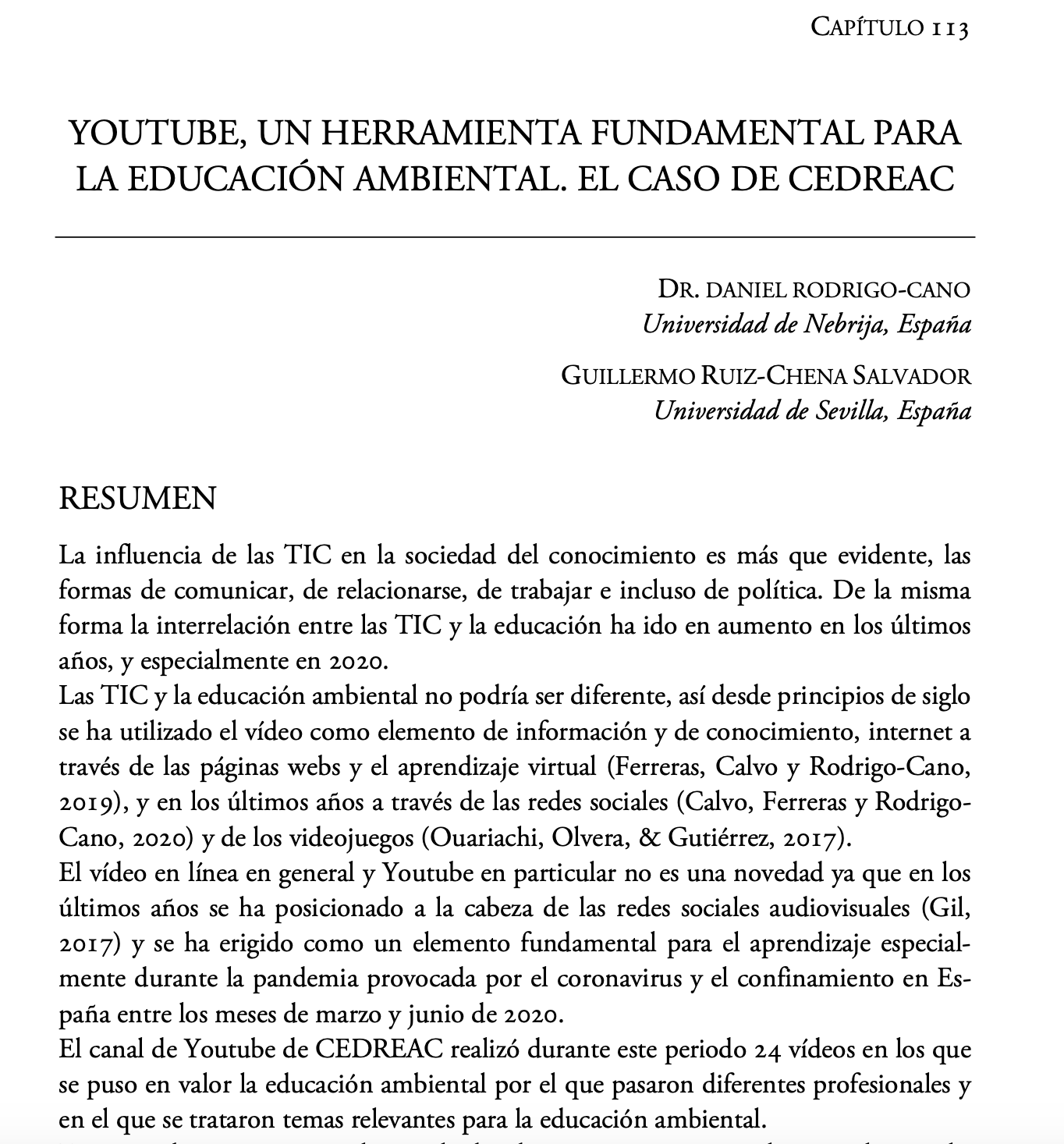 Citar: Rodrigo-Cano, Daniel, & Ruiz-Chena, Guillermo (2020). Youtube, un herramienta fundamental para la educación ambiental. caso de Cedreac. En Manuel Bermúdez Vázquez (Eds) Luces en el camino: Filosofía y ciencias sociales en tiempos de desconcierto (pp. 2211-2229). Madrid: Dykinson.